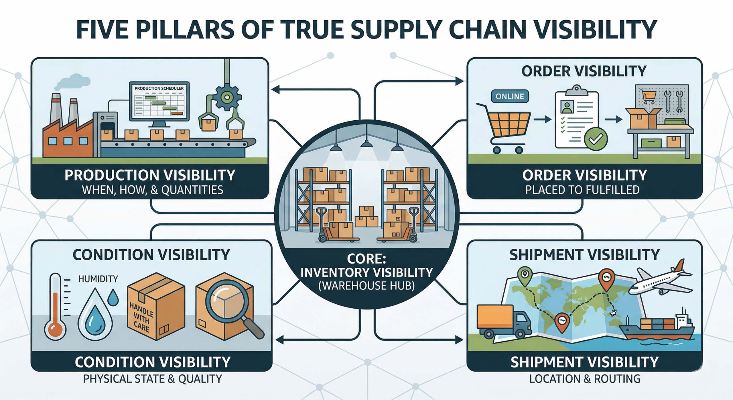 - Condition visibility: Going beyond mere location, this involves tracking the physical state of the products—such as temperature, humidity, or potential transit damage—ensuring strict quality control.